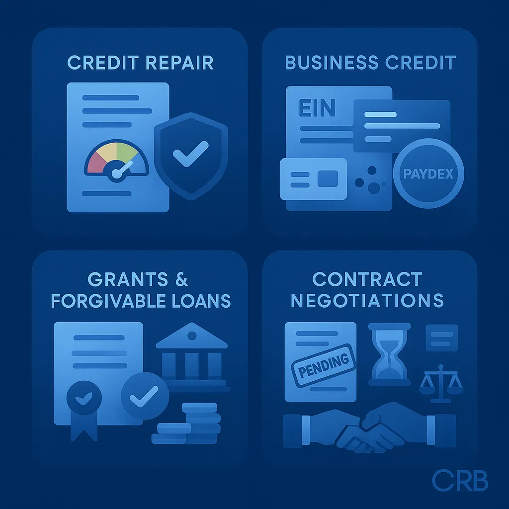 Credit CRB’s Total Financial Reset Bundle unifies four power services into one plan: Elite Credit Repair to dispute inaccuracies and lift scores; Business Credit Building to set up; Grants & Forgivable Loans to find and prepare targeted applications; and expert Contract Negotiations to lower major vendor pricing—delivered with clear steps and transparent progress updates.